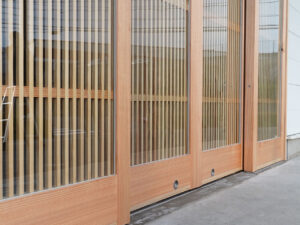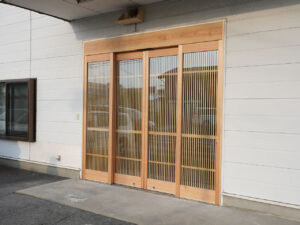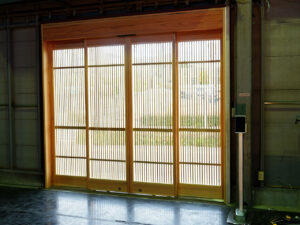 南三陸町産の木をふんだんに使用した木製自動ドアを設置しました。